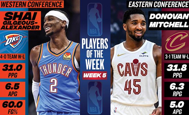 NBA官方公布了第5周的东西部周最佳球员,东部由骑士后卫米切尔当选,西部由雷霆后卫SGA当选。米切尔上周场均攻下31.8分+5篮板+6.3助攻+1.3抢断,三项命中率分别为56.6%,43.2%和81%,带领骑士取得3胜1负的战绩。据统计,这是米切尔生涯第9次当选周最佳球员。SGA上周场均砍下31分+4.5篮板+6.5助攻+2抢断,三项命中率分别为60%,64.3%和90.2%,带领雷霆取得4胜0负的战绩。据统计,这是SGA本赛季第2次当选周最佳球员,也是生涯第8次获此殊荣。值得一提的是,杜伦、基迪、英格拉姆、克尼佩尔、马克西、鲍威尔、小瓦、东契奇、约基奇、福克斯、哈登、阿尔达马等球星获得了周最佳提名。